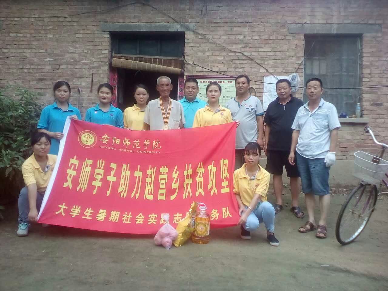 8月6日至7日,安师学子助力赵营乡扶贫攻坚小分队先后来到赵营乡赵营村、中新庄村,走访慰问贫困人员。在赵营村,大学生志愿者们看望有着64年党龄的赵秋海老人,并送去食用油、大米等慰问品。在中新庄村赵永生家里,大学生志愿者们给贫困孤儿赵鑫鑫送去牛奶、面包、文具、玩具等物品,辅导孩子写作业,希望她积极面对生活中的困难,健康快乐地成长。
