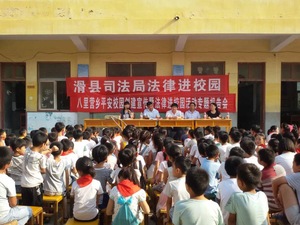 为进一步促进“平安校园”创建和“护校安园”活动的深入开展,切实营造安全和谐的校园环境,维护正常稳定的教育教学秩序,防范和减少各类安全事故的发生,八里营乡司法所、乡综治办结合县司法局、县综治办,利用新学期开始的最佳时机,于9月6日上午,邀请滑县金太阳律师事务所刘志杰律师为黄店小学、北苑村小学的全体师生上了一堂精彩的法律讲课。