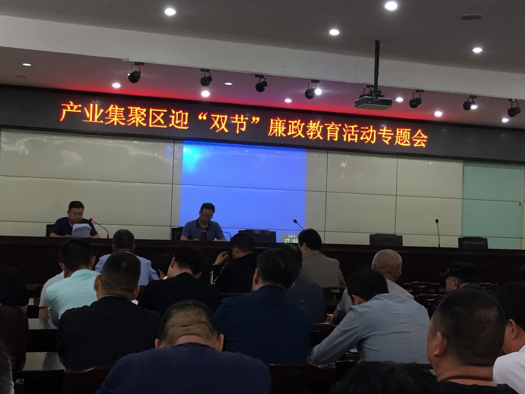 为强化正风肃纪,确保国庆、中秋廉洁过节,2017年9月28日,产业集聚区组织全体机关干部和全区37个行政村党支部书记参加了党风廉政建设专题会议。