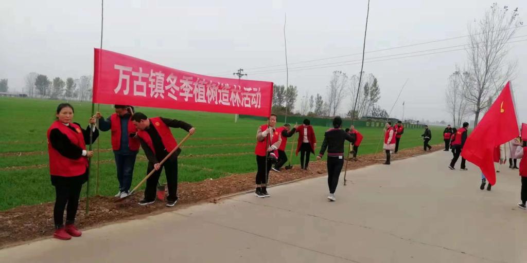 11月17日下午,万古镇组织机关全体干部职工和文明使者100余人在该镇新庄村北地道路两侧开展冬季义务植树活动。