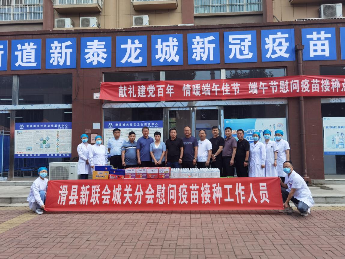6月18日上午,滑县新联会城关分会到城关街道新泰龙城疫苗接种点慰问奋战在新冠疫苗接种点的一线工作人员。会员们将牛奶、矿泉水、方便面等慰问品送到一线工作人员手中,滑县新联会城关分会慰问组还与工作人员进行了亲切交谈,对奋战在一线的广大工作人员恪尽职守、无私奉献表示由衷的感谢和崇高的敬意。城关街道人大工委主任张永强、城关街道社区卫生服务中心主任宋庆军参加此次慰问。