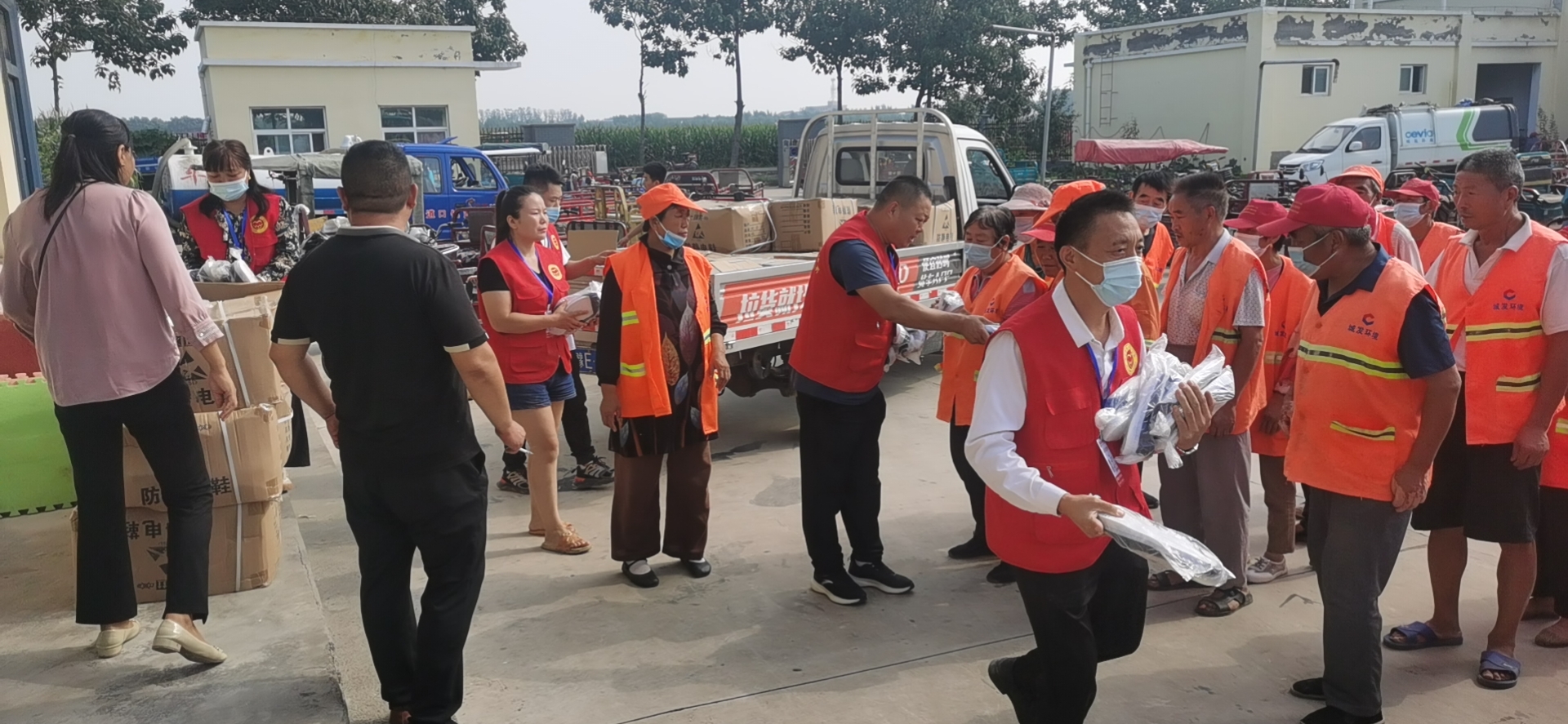 志愿者一边给环卫工人分发鞋子一边叮嘱他们天气凉了要多注意身体。
