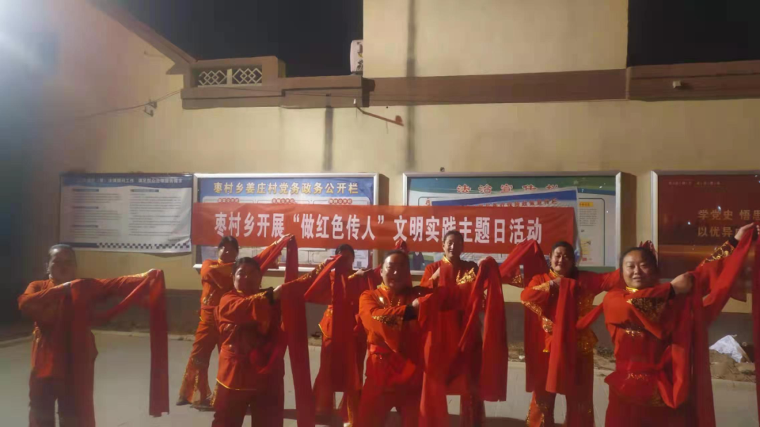 当日,枣村乡开展“做红色传人”文明实践主题日活动。紧紧围绕迎接宣传贯彻党的二十大这条主线,组织村文艺队通过传唱红色歌曲、展演红色节目等形式,开展焦裕禄精神、红旗渠精神、愚公移山精神、大别山精神等学习教育活动及中华文化弘扬传承活动。通过百姓喜闻乐见的文艺宣传形式,让大家在红色精神熏陶中感悟家国情怀,教育引导广大群众坚定不移听党话、跟党走。