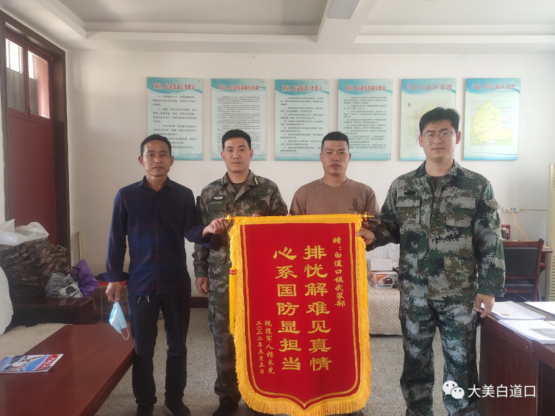 “非常感谢你们白道口镇武装部解决了我家宅基地纠纷,让我在部队里面能安心训练和生活,今天特来给你们送一面锦旗表示感谢。”白道口镇武装部长何录明从西安某部队现役军人杨长光手里接过绣有“排忧解难见真情、心系国防显担当”的锦旗,这是近日发生在滑县白道口镇武装部办公室里的一幕。
