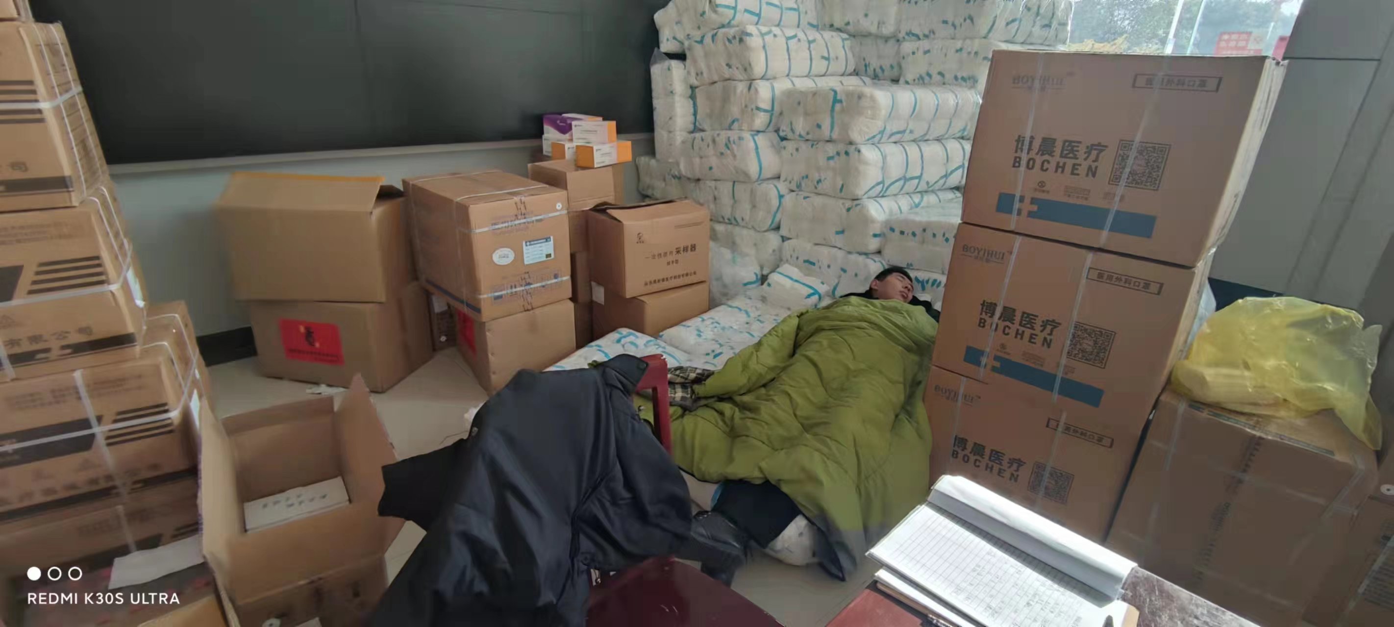 这次也不是黄泽文第一次参与防疫工作了,2022年年初,滑县锦和街道发生一例确诊病例,疫情形势纷繁复杂,他参与多次集中隔离群众的转运,负责了数百万人次的核酸检测物资筹备、分发。在数不清的严寒夜晚,在堆满医疗物资的机关大厅里,蜷缩地睡在物资中、工作需要马上投入激烈的战斗成为了他的写照。