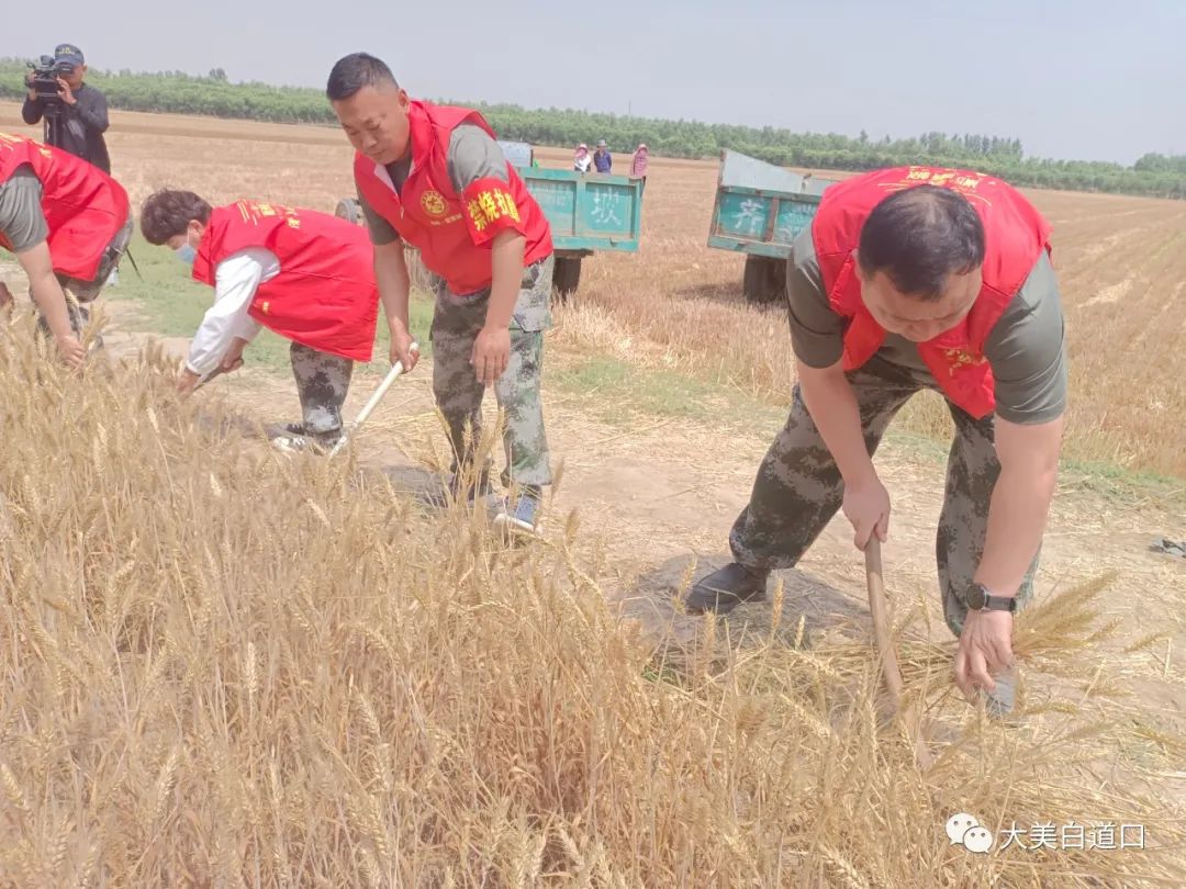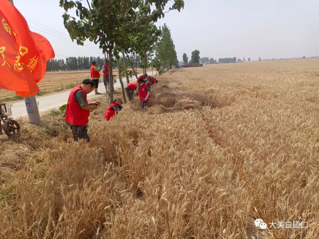 “三夏”时节,走进白道口镇大刘营村,麦浪滚滚,机声隆隆,一片丰收的繁忙景象映入眼帘。金色田间里,一个个“红马甲”和迎风飘扬的志愿服务队旗跃动闪亮。为切实解决困难群众“三夏”生产的实际困难,白道口镇充分发挥党员先锋模范作用,成立由党员、机关干部、大学生组成的志愿服务队助力“三夏”生产。