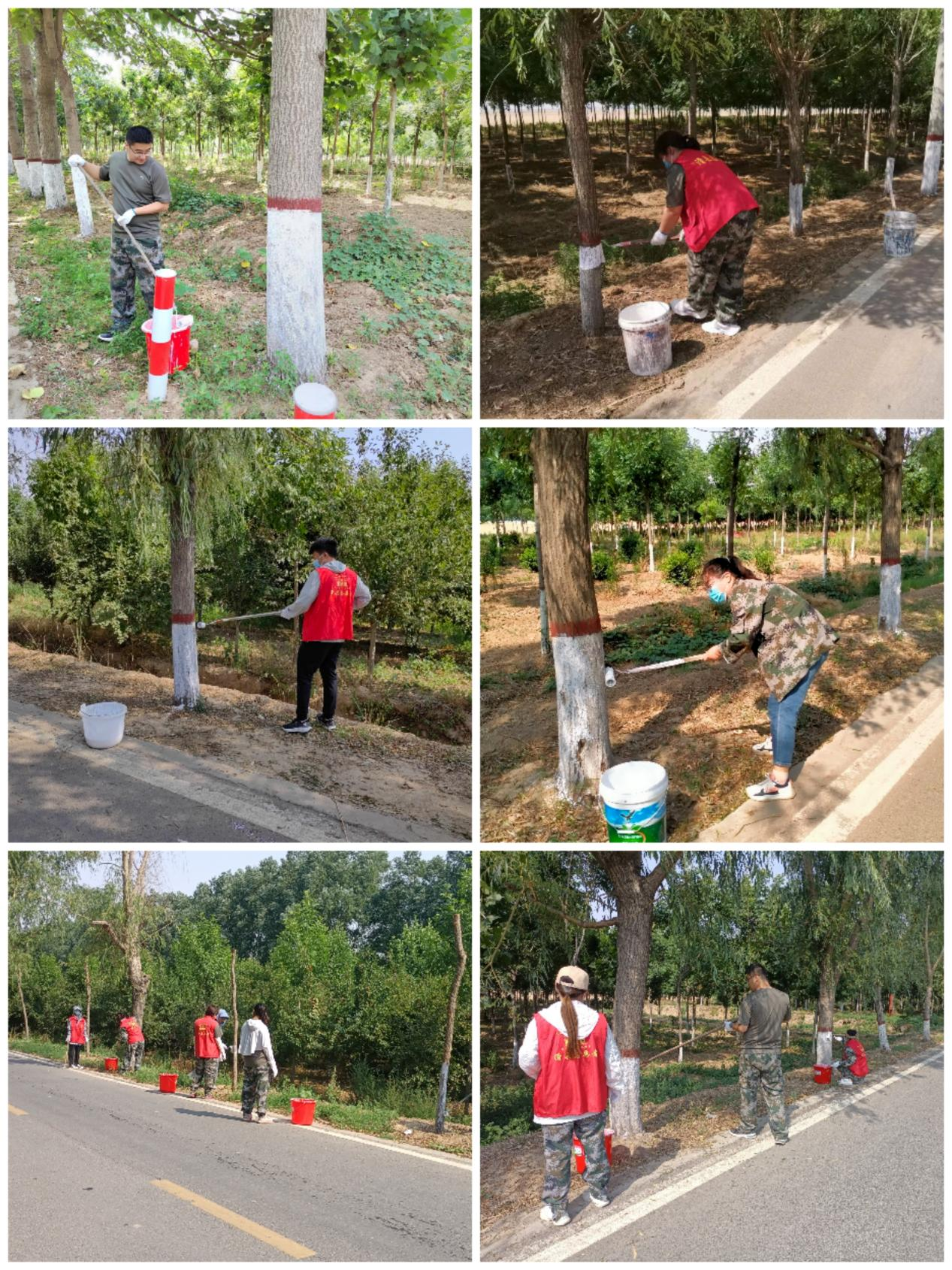大家分工合作、干劲十足,积极投入到粉刷树木活动中。拿着刷子、提着桶子……每个人脸上都洋溢着劳动的喜悦。