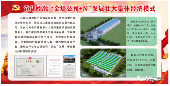 今年以来,白道口镇以“五星”支部创建为契机,抢抓“中心镇”发展机遇,大胆创新改革,率先尝试党建引领“金堤公司+N”发展壮大集体经济模式,积极探索村镇经济体制改革,率先成立金堤城镇建设发展有限公司,出台《关于支持发展壮大村级集体经济的实施意见》,依托崔郭庄韭菜无公害绿色品牌,发展韭菜大棚种植和深加工两个项目,有效整合村级资源,分批吸纳村级合作社入股,做大做强韭菜产业,推动合作社与金堤公司“绑定”发展,形成稳定的利益联动机制。