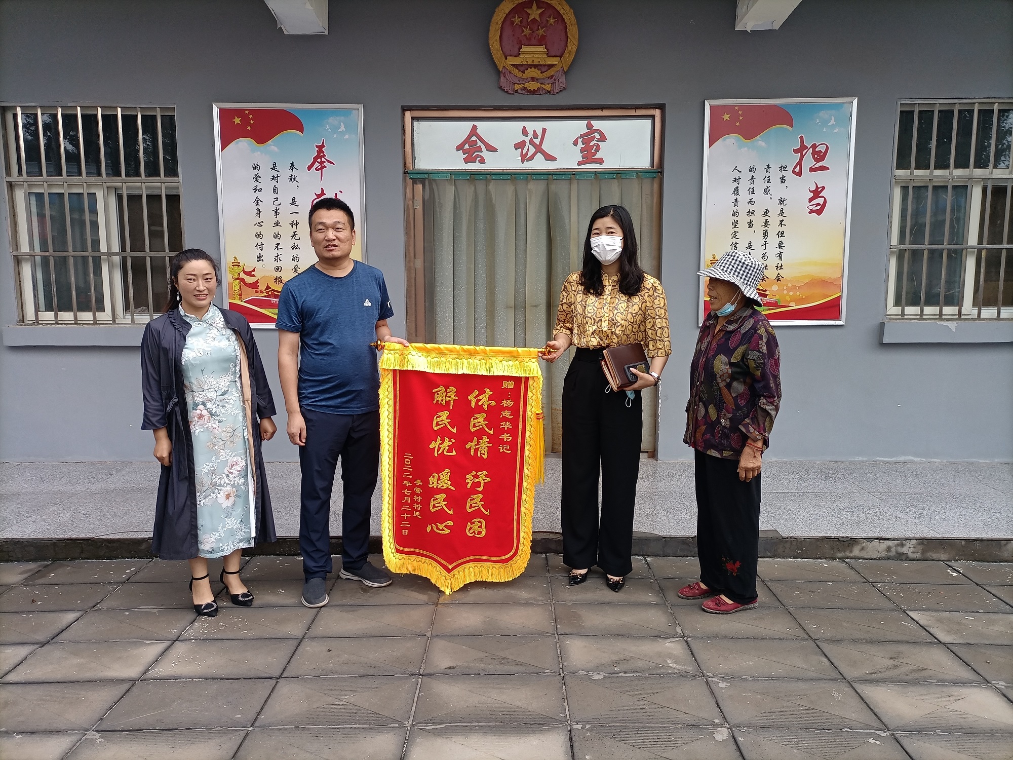 7月23日上午,白道口镇李营村两名村民将一面写有“体民情 纾民困 解民忧 暖民心”的锦旗送到白道口镇党委委员、纪委书记、李营区区委书记杨志华手中,以表达对她的感激之情。
