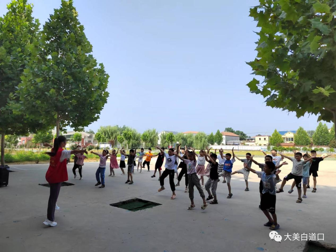 青春活力的音乐在操场响起,小朋友们整齐的排列,活力四射,动作青春洋溢,随着音乐节奏不停变换动作和队形,俨然成为操场上一道靓丽的风景线。志愿者安妮是一名大三在校体育生,她的妈妈是白道口镇北留村小学的一位老师,每年暑假,她都会去学校教小朋友们跳舞、跳体操、打太极,为同学们的学习生活,增添了别样的乐趣。这不仅能锻炼身体、增强团结合作的意识,还丰富了课外生活,培养了学生相互配合的集体荣誉感。