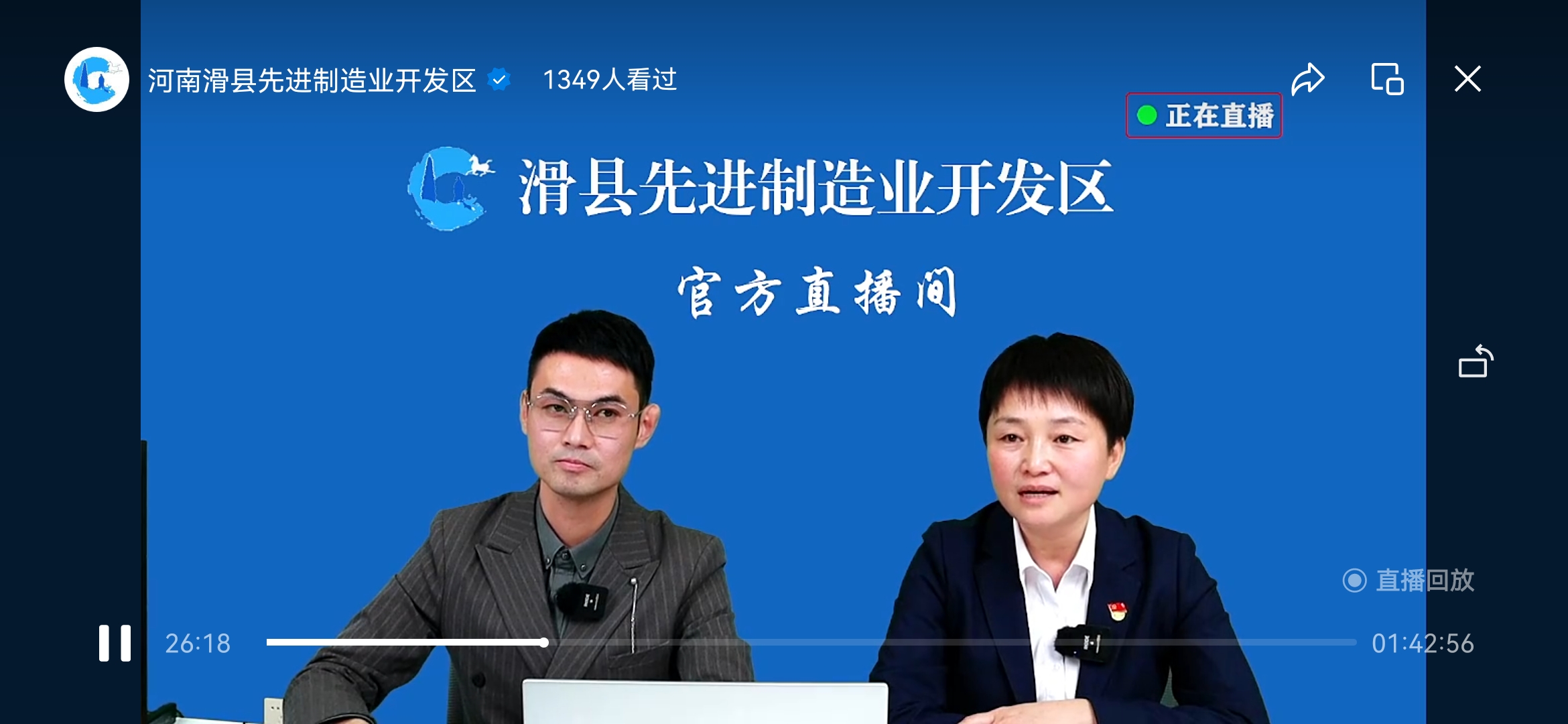 为提升滑县先进制造业开发区影响力,打造开发区新名片,12月9日,滑县先进制造业开发区在官方抖音号和视频号举办了首场直播,邀请滑县网红达人丁一做客直播间,开发区管委会副主任孔聪利在直播中介绍了开发区体制机制改革工作及成效,随后三强医疗、开伦化工、牧原3家重点企业轮番上阵“带岗”,为时1个半小时的直播累计3万人次观看。