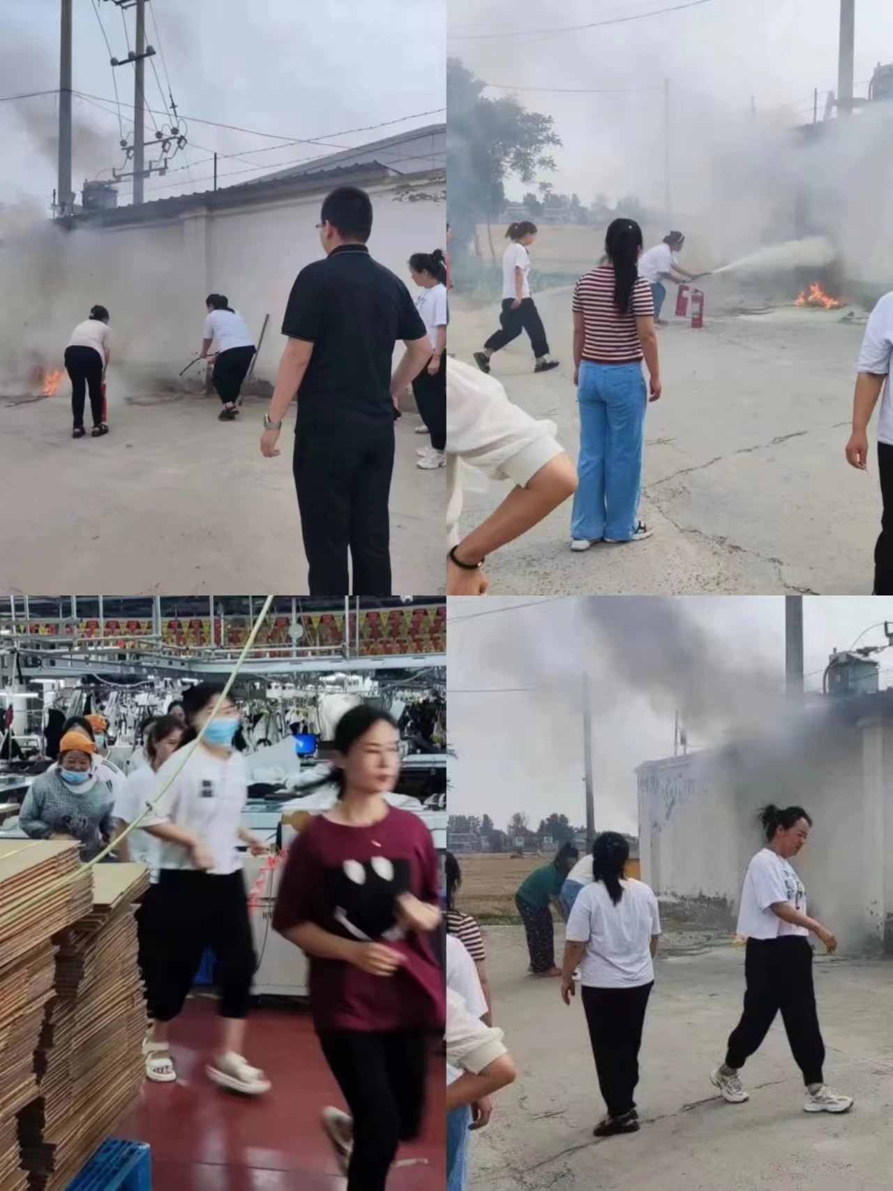 随后,工作人员在常青服装厂第二十七分厂组织全体职工开展消防应急演练。本次演练以企业生产车间突发火情为场景,随着生产车间内烟雾弥漫,消防警报响起,工作人员发现火情后开展救火并及时拨打“119”报警,随后立即组织现场人员弯腰低头、手捂口鼻按照疏散逃生路线快速、有序撤离至安全地带。接到报警后,消防救援人员迅速启动火灾应急处置预案,救护车、派出所等第一时间赶赴现场,各部门明确分工、协同作战,建立疏散警戒队伍,进行全面专业扑救及开展人员救援,火势得到控制,人员迅速被救出,此次消防应急演练快速、高效、有序、圆满完成。演练结束后,工作人员再次向企业员工重点讲解了消防水带、水枪、灭火器等消防器具的使用方法,并现场进行正确操作示范。