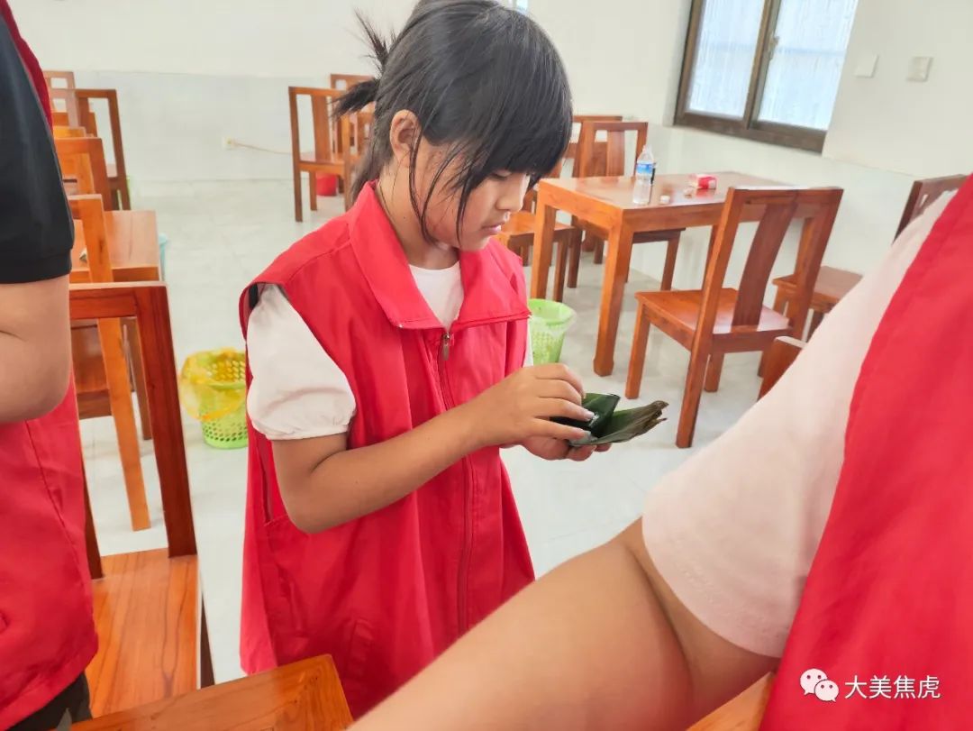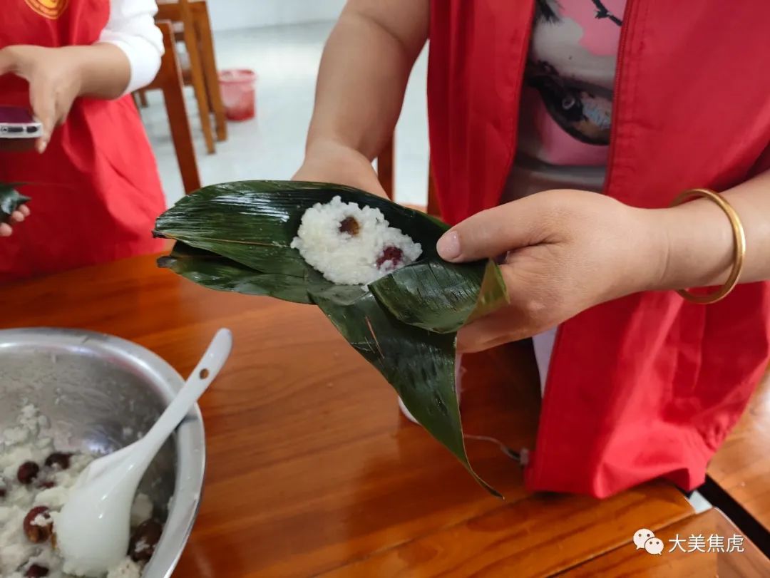 焦虎镇的党群干部们一同准备好糯米、大枣、粽叶等原材料,在镇政府餐厅,大家齐动手,围在一起包粽子,大家互相交流、互相学习,拿粽叶做漏斗,填糯米、填红枣、压实封口、扎绳,转眼间,一个个有模有样的粽子就包成了,大家在一起欢声笑语,共同分享传统节日的快乐,感悟传统文化的魅力。
