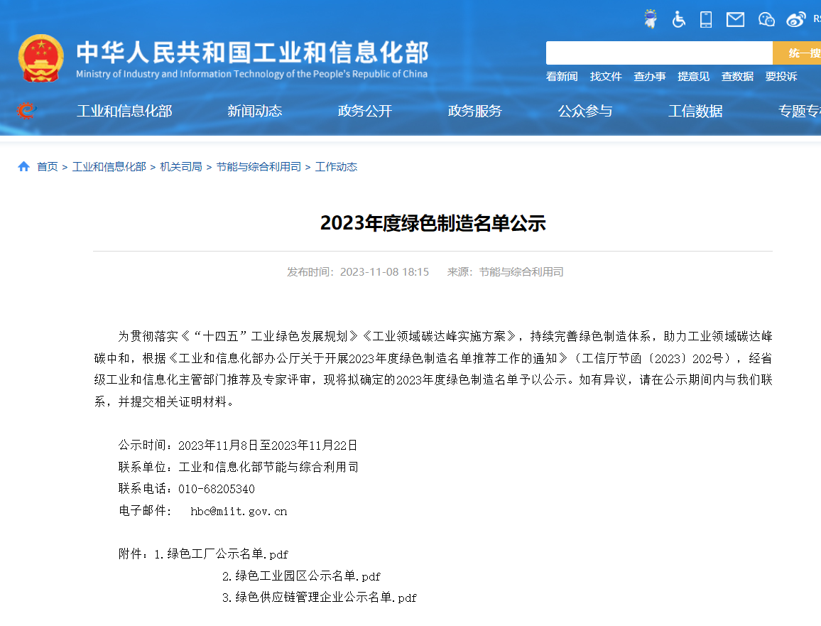 近日,国家工业和信息化部公布了2023年度绿色制造名单