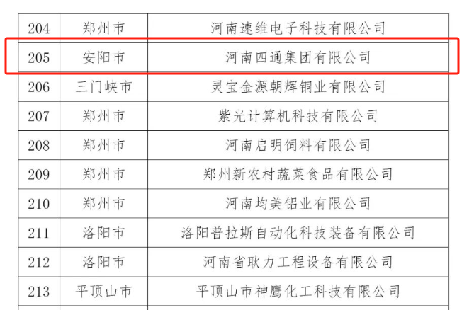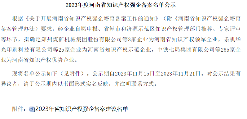 11月15日,河南省知识产权局官网发布通知公告,公示2023年度河南省知识产权强企备案名单,开发区河南四通集团有限公司被认定为河南省知识产权优势企业。