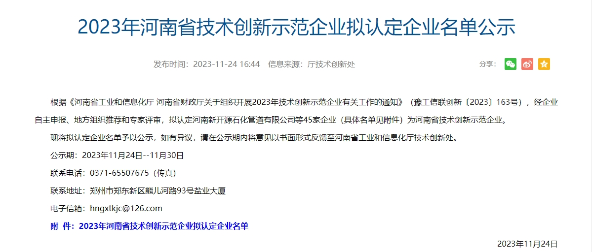 近日,省工信厅、财政厅公布了《关于组织开展2023年技术创新示范企业有关工作的通知》(豫工信联创新〔2023〕163号),全省拟认定45家企业为2023年河南省技术创新示范企业,开发区河南四通精密模具有限公司榜上有名。