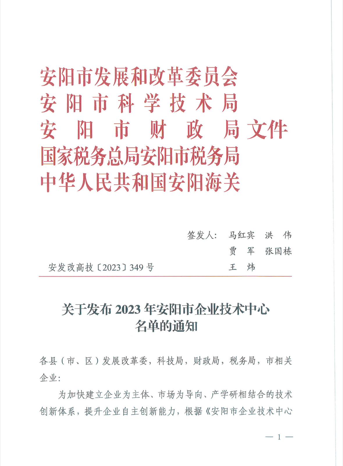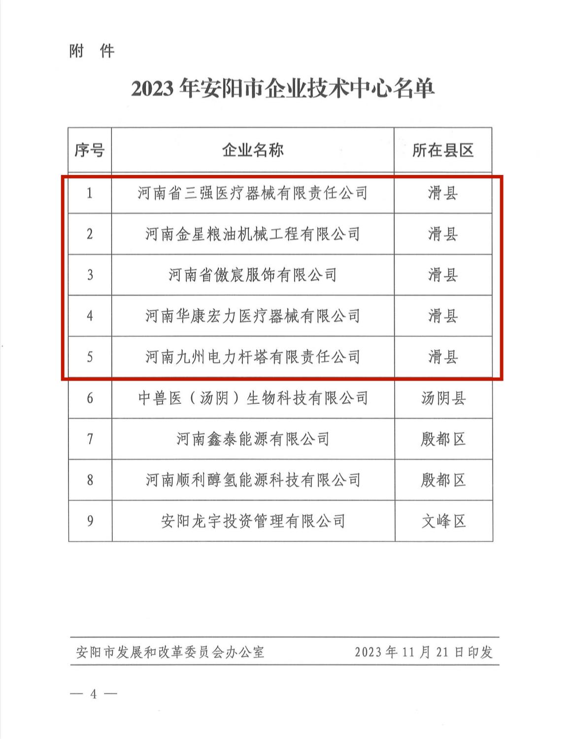 近日,2023年安阳市企业技术中心名单公布,全市共计通过9家企业,其中开发区5家企业上榜,分别为河南省三强医疗器械有限责任公司、河南金星粮油机械工程有限公司、河南省傲宸服饰有限公司、河南华康宏力医疗器械有限公司和河南九州电力杆塔有限责任公司。