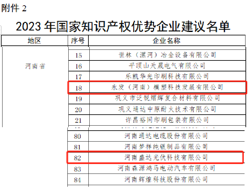 近日,国家知识产权局发布了《关于2023年度国家知识产权优势企业和示范企业评定结果的公示》,开发区永发(河南)模塑科技发展有限公司、河南盛达光伏科技有限公司两家企业榜上有名,入选国家知识产权优势企业。