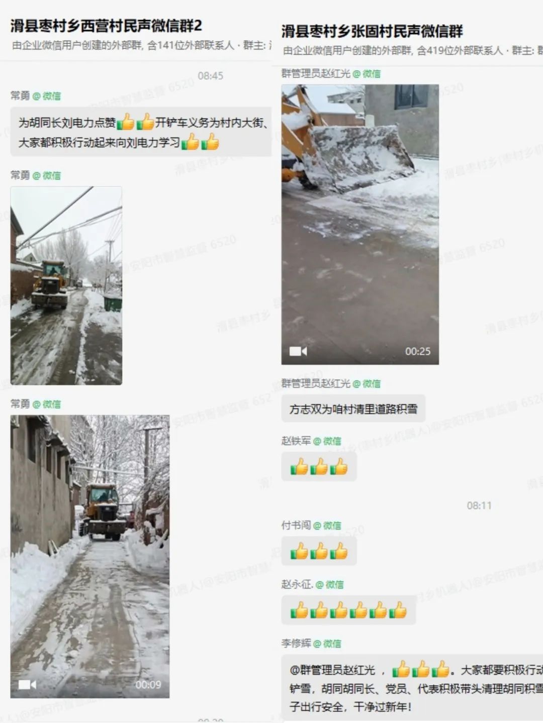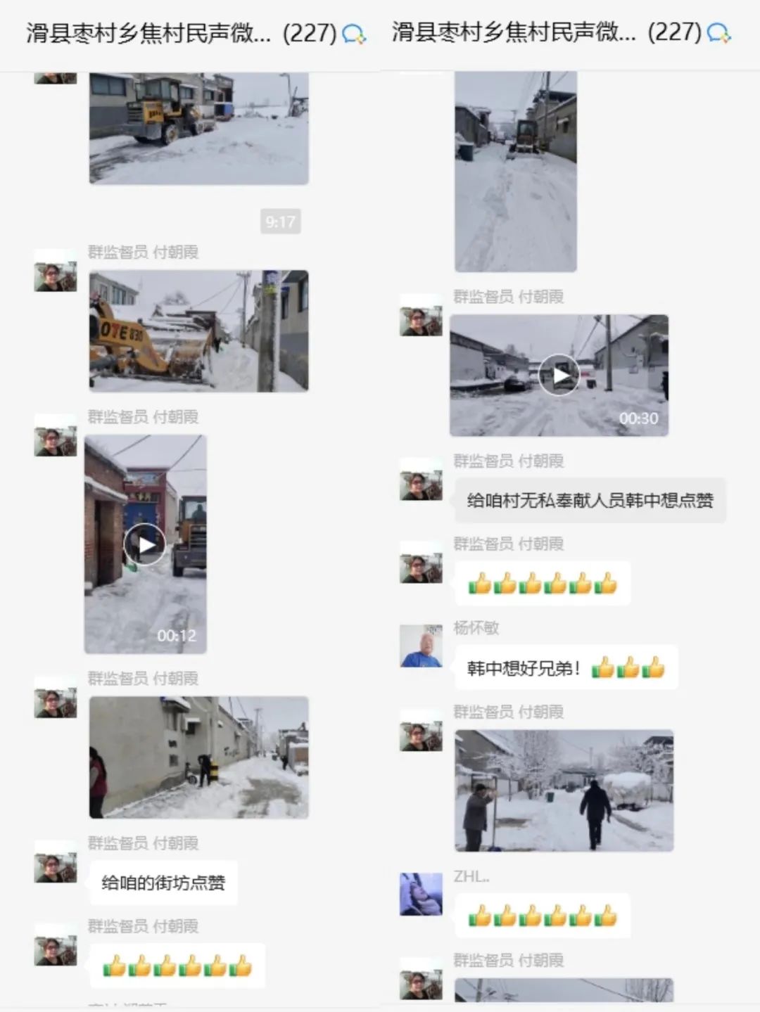 “给咱的街坊点赞”“给咱村无私奉献人员韩中想点赞”“为胡同长刘电力点赞,开铲车义务为村内大街、胡同铲雪,大家积极向刘电力学习”......1月16日上午,枣村乡各个村的民生微信群甚是热闹,村两委干部、党员、志愿者们在寒冬中自发义务扫雪除冰的一段视频和照片,赢得了广大群众的一致点赞。