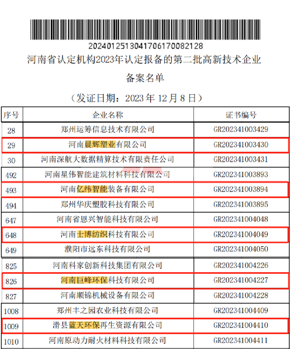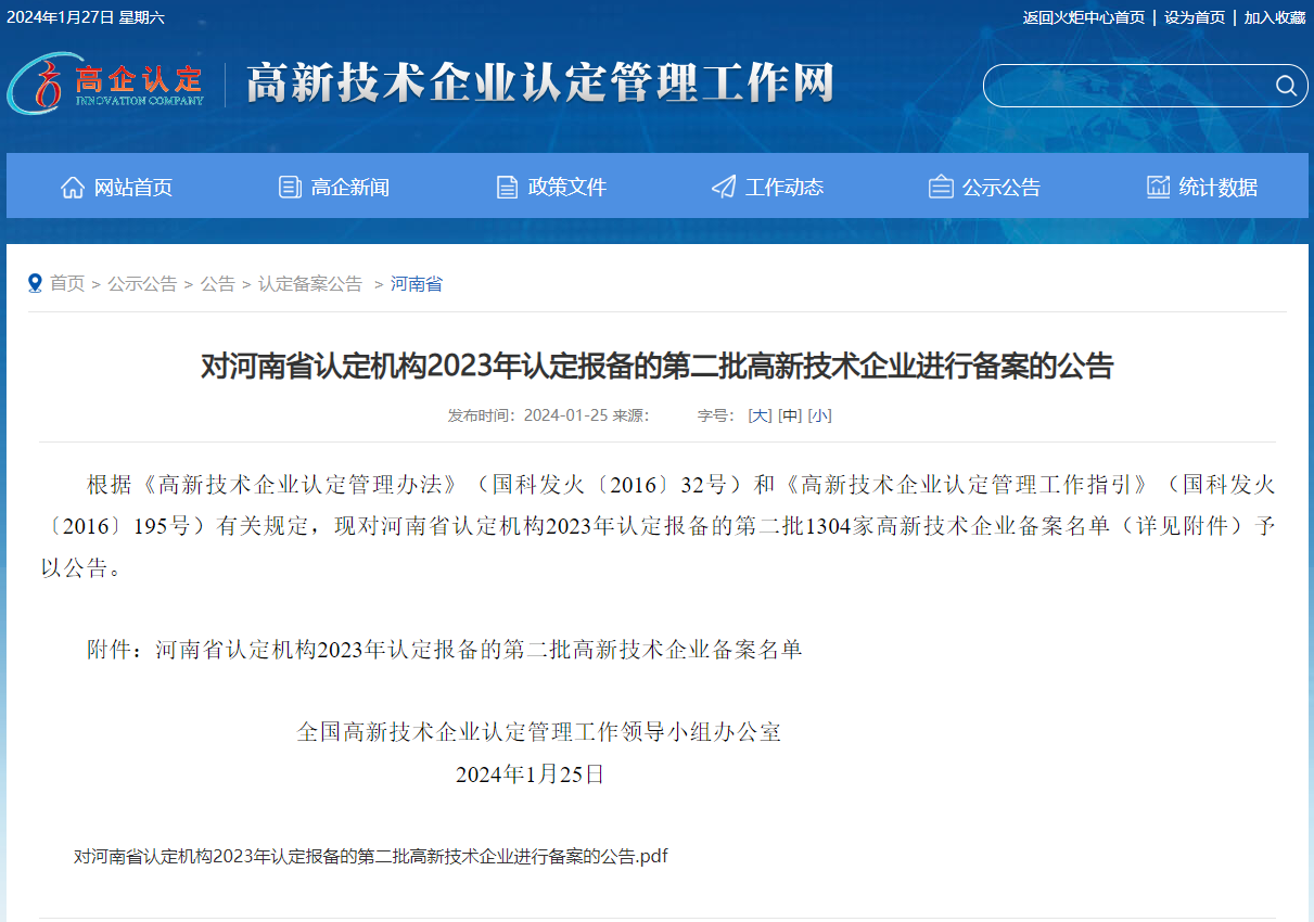 1月25日,全国高新技术企业认定管理工作领导小组办公室发布《对河南省认定机构2023年认定报备的第二批高新技术企业进行备案的公告》,开发区5家企业上榜。