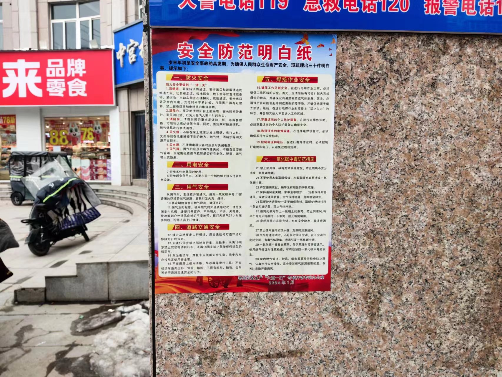 为切实保障辖区人民群众生命财产安全,牢固树立安全发展理念,弘扬生命至上、安全第一的思想,1月30日,城关街道发放《安全防范明白纸》并张贴在醒目位置,提高群众安全防范意识。