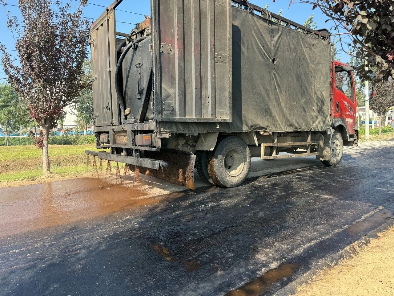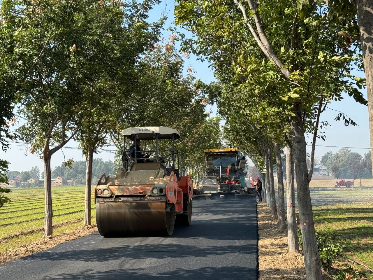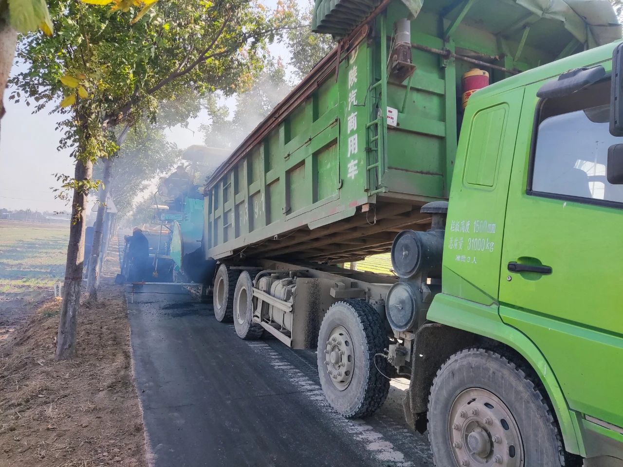 10月23日,在枣村乡小营村至什庄村段道路施工现场,一派热火朝天的繁忙景象。摊铺机、喷油机、压路机正在紧张作业,施工人员忙碌着摊铺沥青、平整路面,一条崭新的柏油路正徐徐向前延伸,与道路两侧整齐美观的行道树构成了一道最亮丽的风景线。