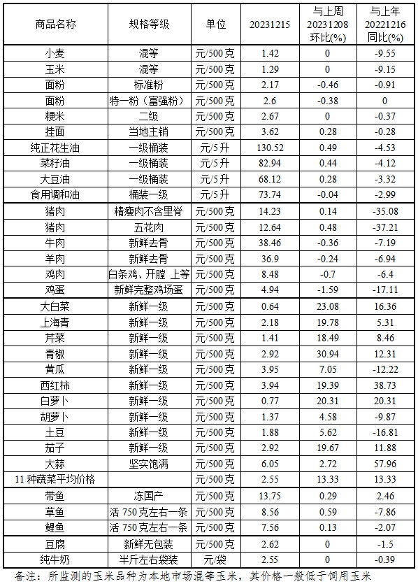 一、粮油价格整体稳定。12月15日,所监测的6种粮食及制品均价分别为:小麦(混等,下同)1.42元/500克、玉米(混等,下同)1.29元/500克、标准粉2.17元/500克、特一粉(富强粉)2.6元/500克、粳米2.67元/500克、挂面3.62元/500克。与上周比,原粮及粮食制品均价总体平稳;与上年同期比,小麦、玉米均价分别下降9.55%、9.15%,粮食制品均价基本稳定。所监测的4种食用油均价分别为:纯正花生油130.52元/5升、菜籽油82.94元/5升、大豆油68.12元/5升、食用调和油73.74元/5升。与上周比,食用油均价总体平稳;与上年同期比,食用油均价整体下降,降幅分别为:纯正花生油4.53%、菜籽油4.12%、大豆油3.32%、食用调和油2.99%。