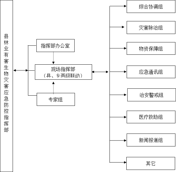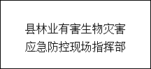 县指挥部其职责是:负责研究制定林业有害生物灾害应急防控方案;建立监测预警支持系统、应急保障队伍、保障体系,批准发布预警公告;宣布启动或结束应急预案,组织、指挥应急防控工作;协调、解决应急救灾中遇到的资金、物资、交通、气象、保卫、通讯、人员、封锁、救助等问题;审查批准指挥部办公室或专家组提交的工作报告等。
