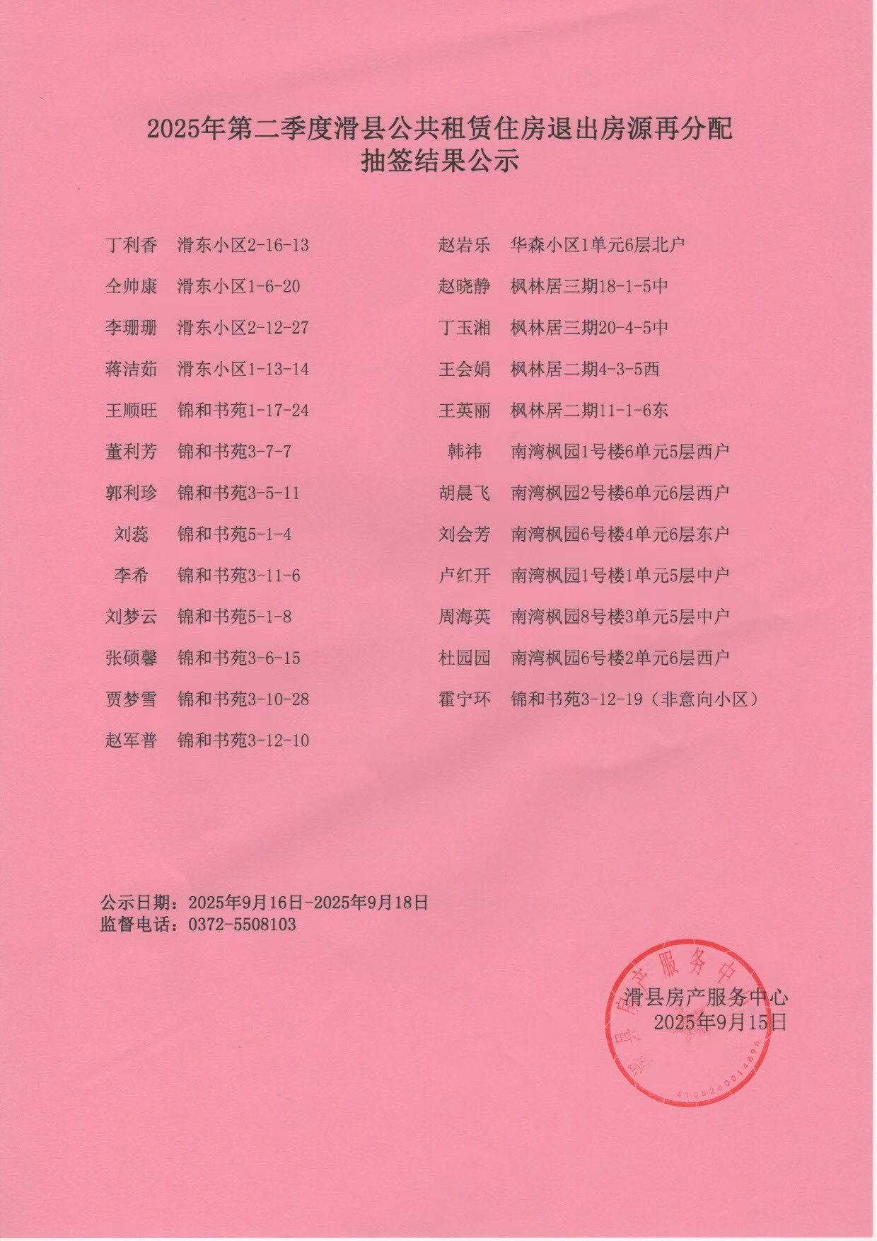 2025年第二季度滑县公共租赁住房退出房源再分配抽签结果公示
