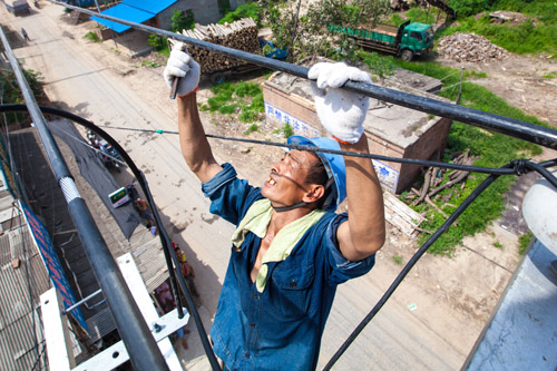 8月14日,室外温度达到35摄氏度,国网滑县供电公司施工人员在该县小铺乡郑庄村正在对高低压线路进行整村改造,确保该村居民更加安全可靠用电。