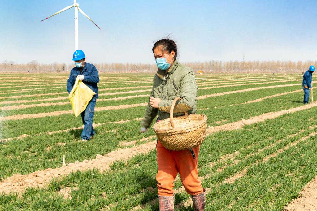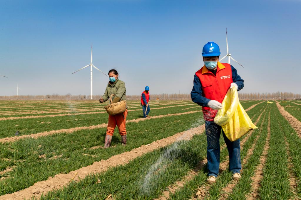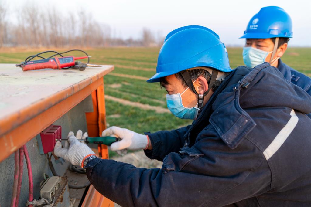 2月23日,河南省安阳市滑县白马坡田地里,国网滑县供电公司党员服务队队员孙桃明,和俊磊正在帮助农民白凤丽一家浇地施肥。气温逐渐回升,在有着“中国小麦第一县”之称的河南滑县,春耕春播陆续展开。