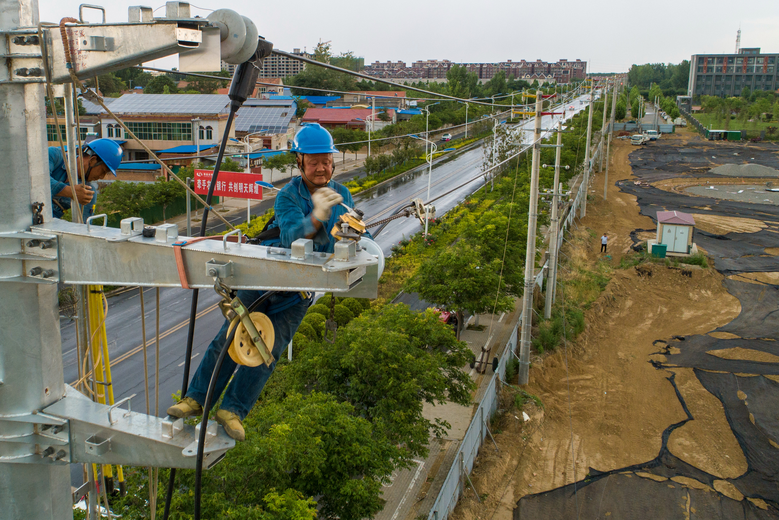 6月14日,天刚蒙蒙亮,雨后的夏风清爽舒适。凌晨5时,国网滑县供电公司40余名电力工人趁着早晨凉爽,已经在河南滑县新建10千伏学府线路施工现场开始作业,争取尽早完工。