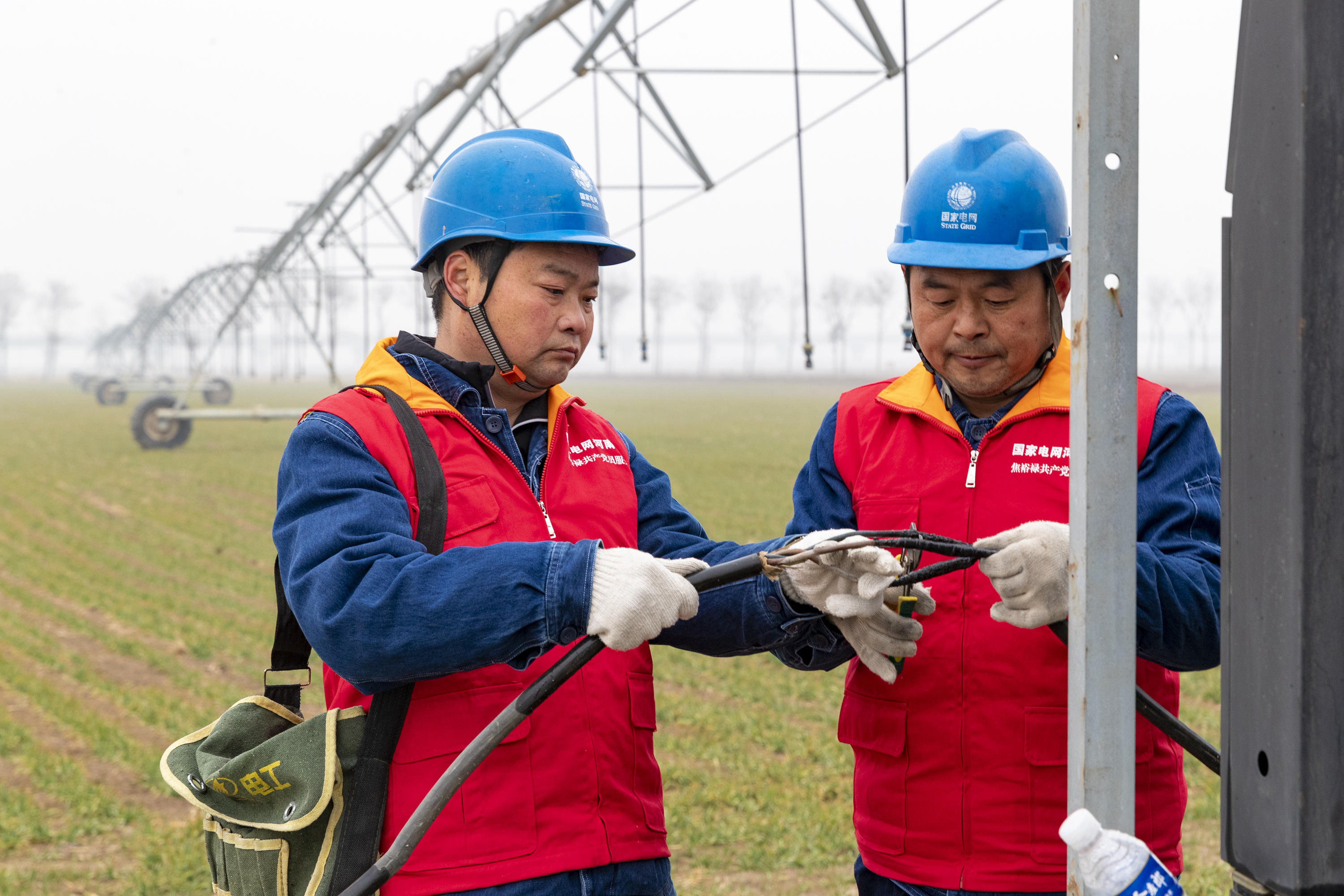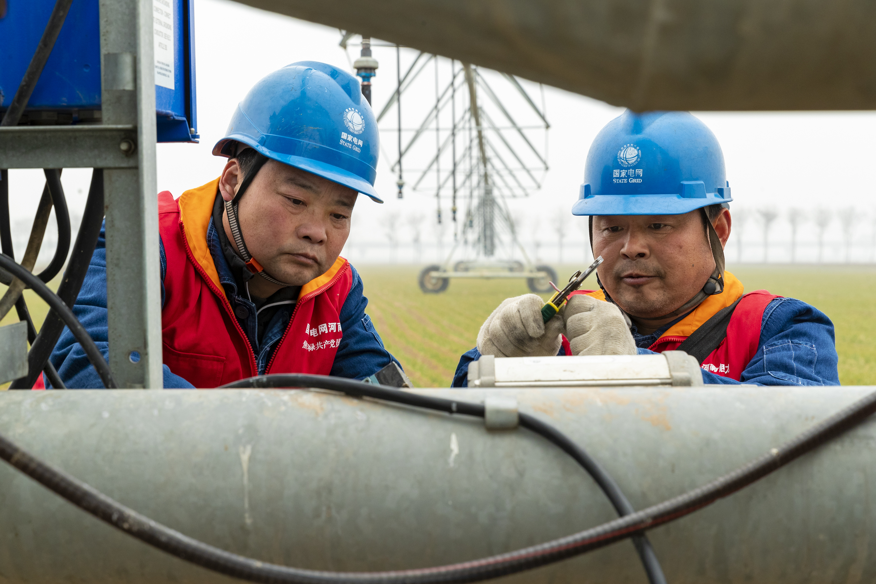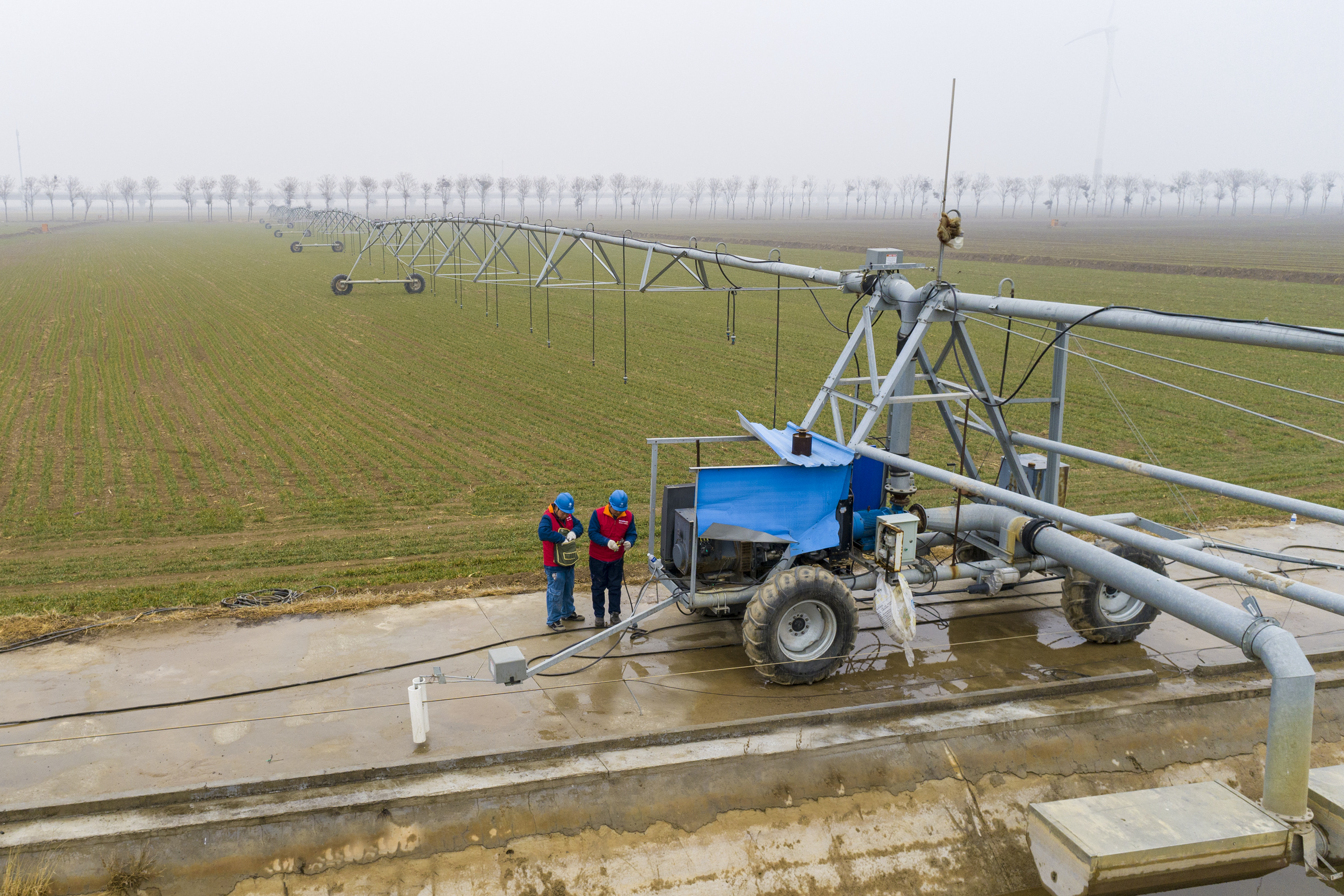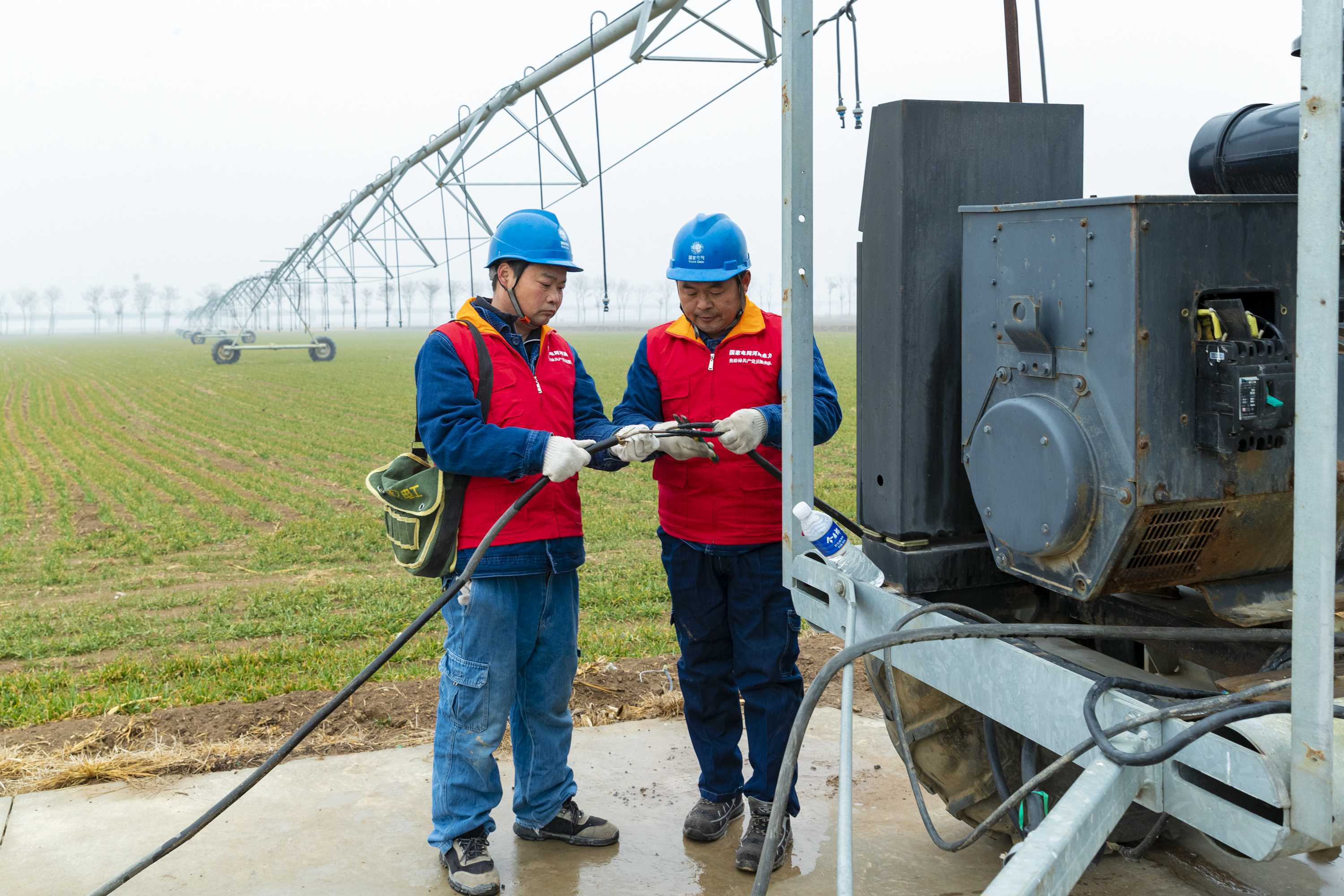 2月13日,在河南安阳滑县白道口蔡胡村,国网滑县供电公司白道口供电所焦裕禄党员服务队王建奇、温红涛正在为移动式多功能大型喷灌设备检查线路和用电设备,确保该设备春罐时安全可靠运行。