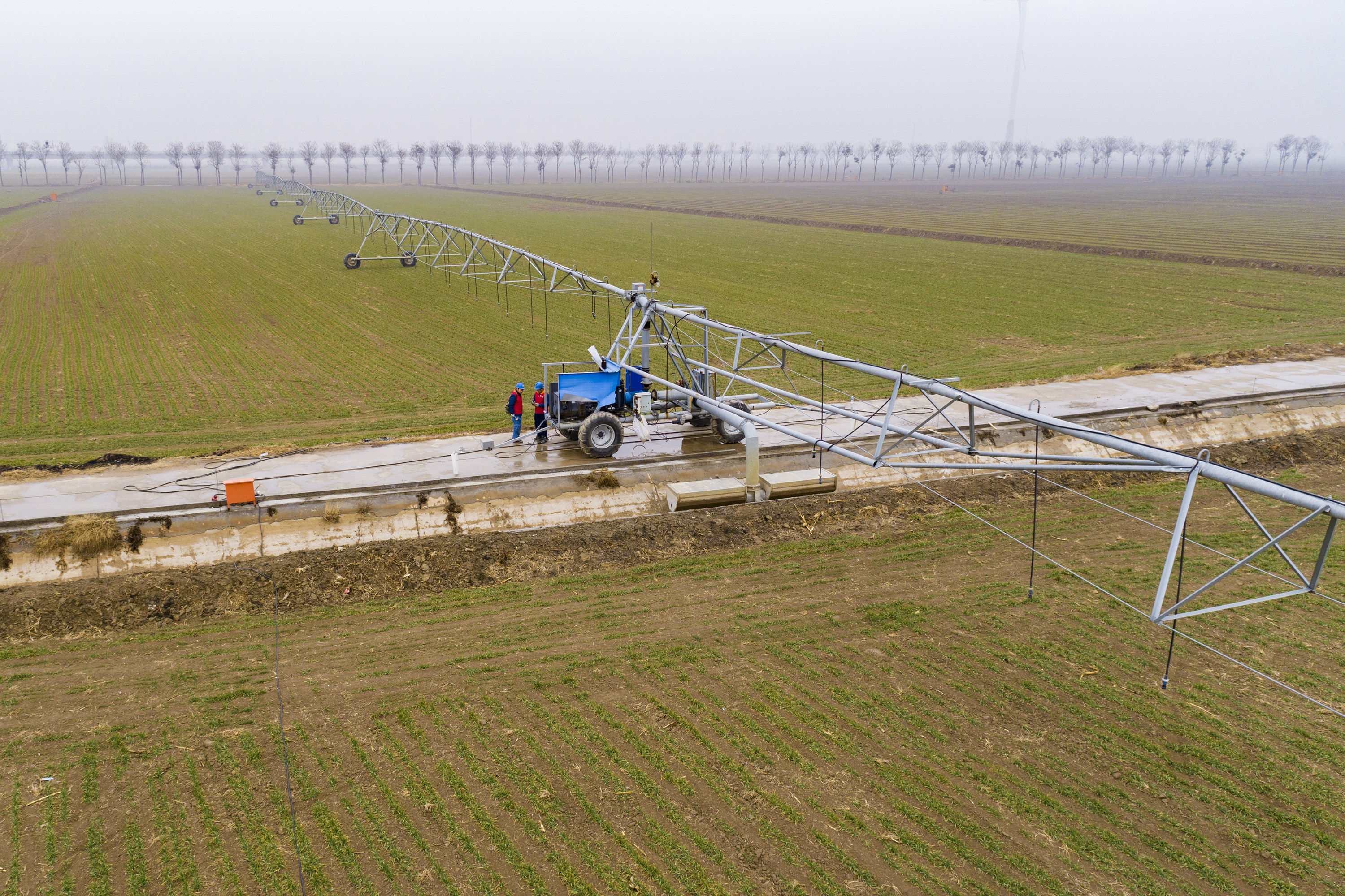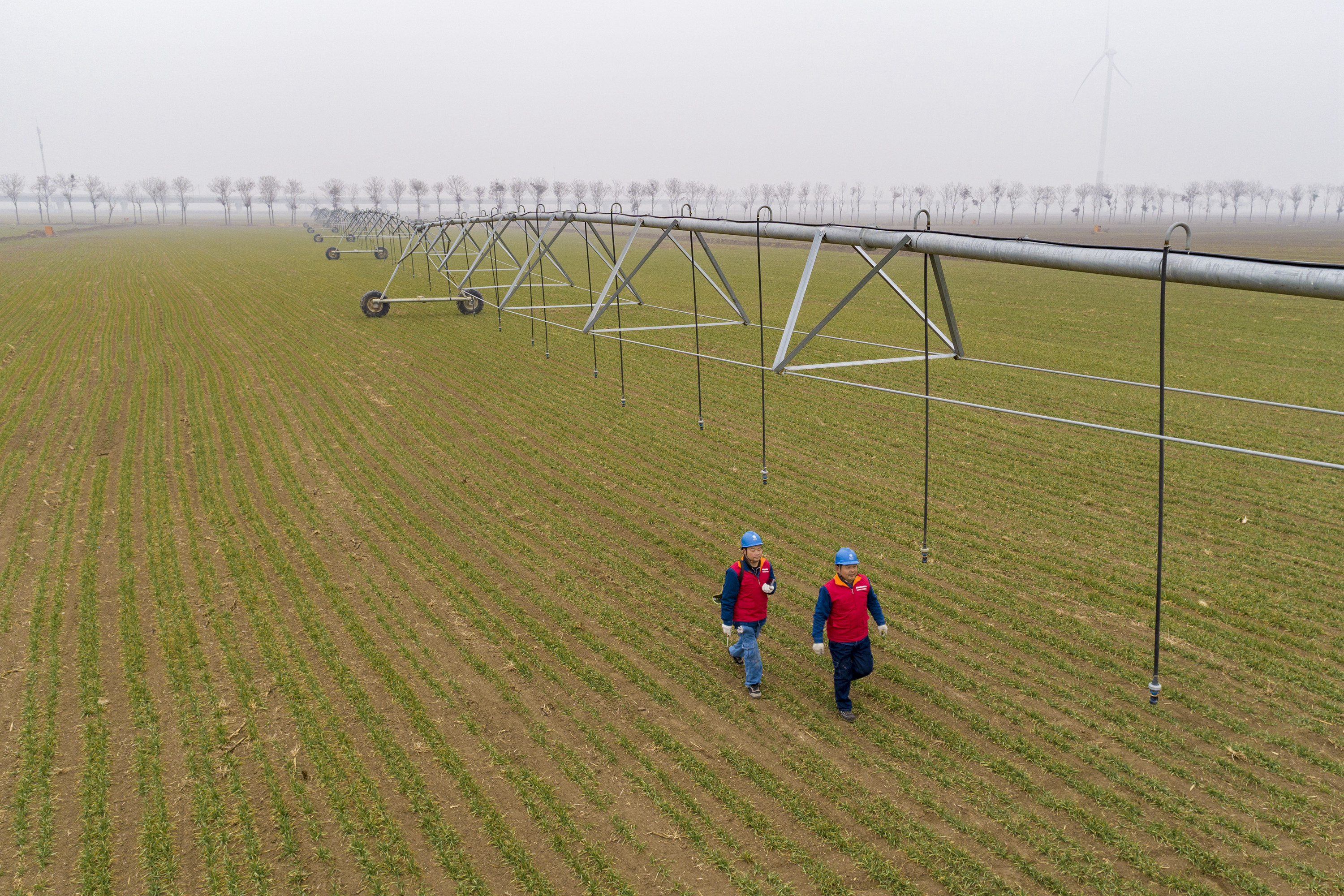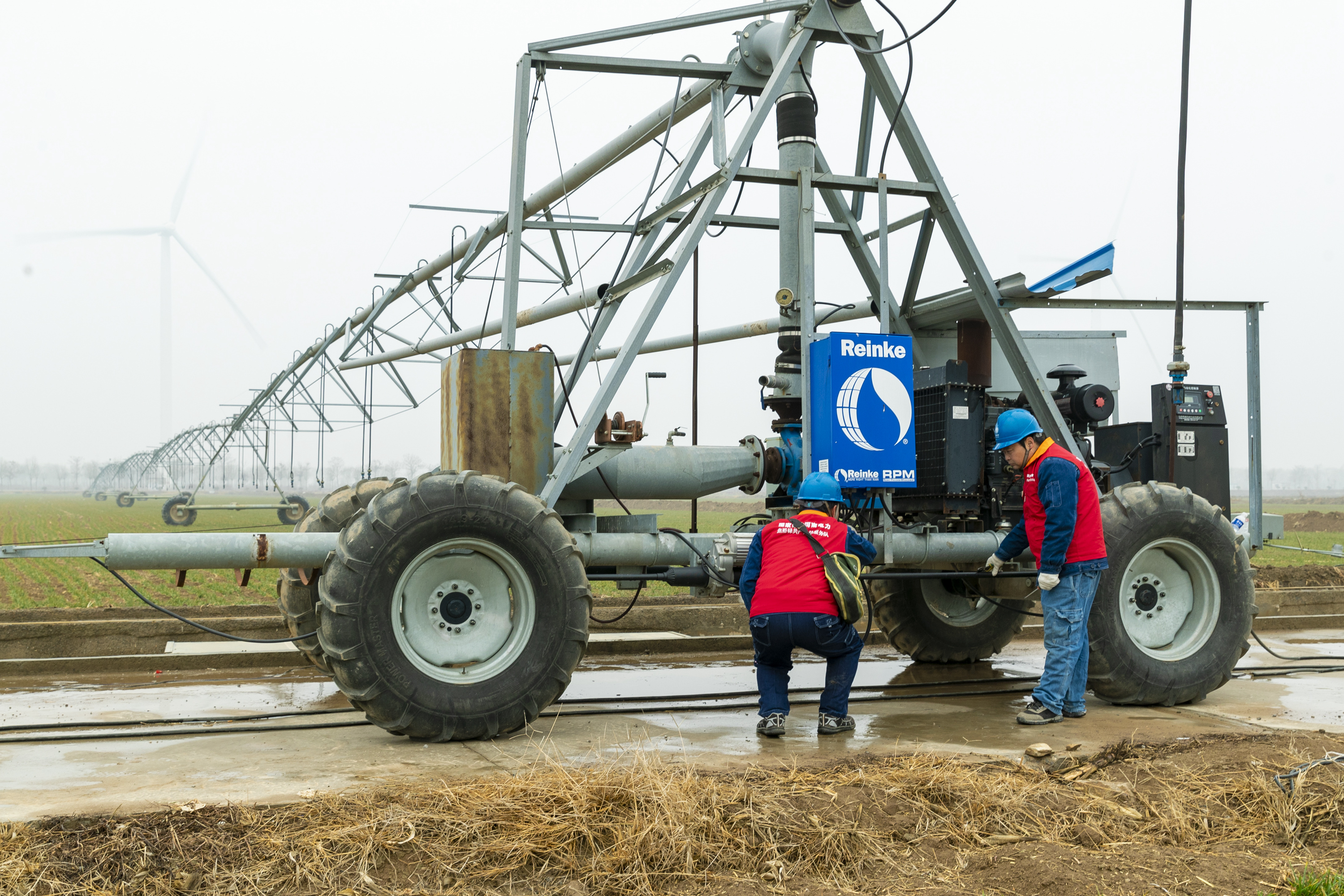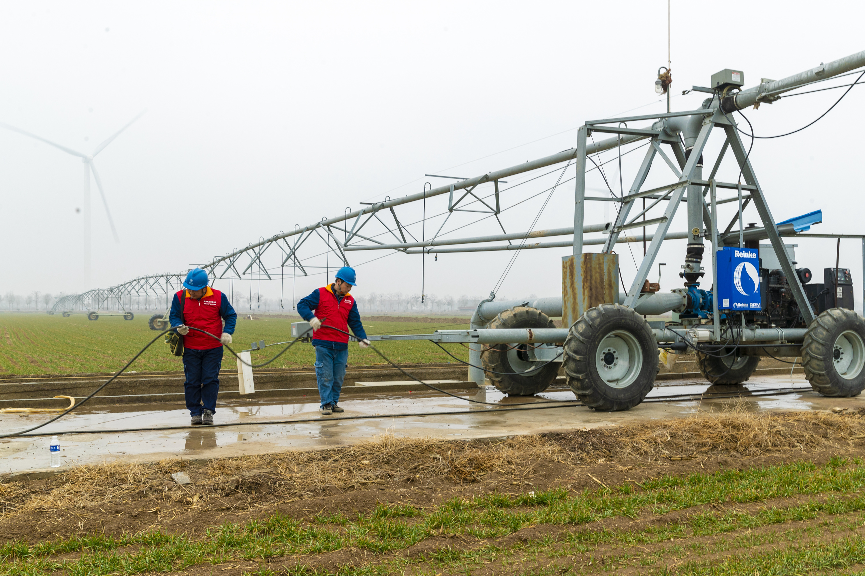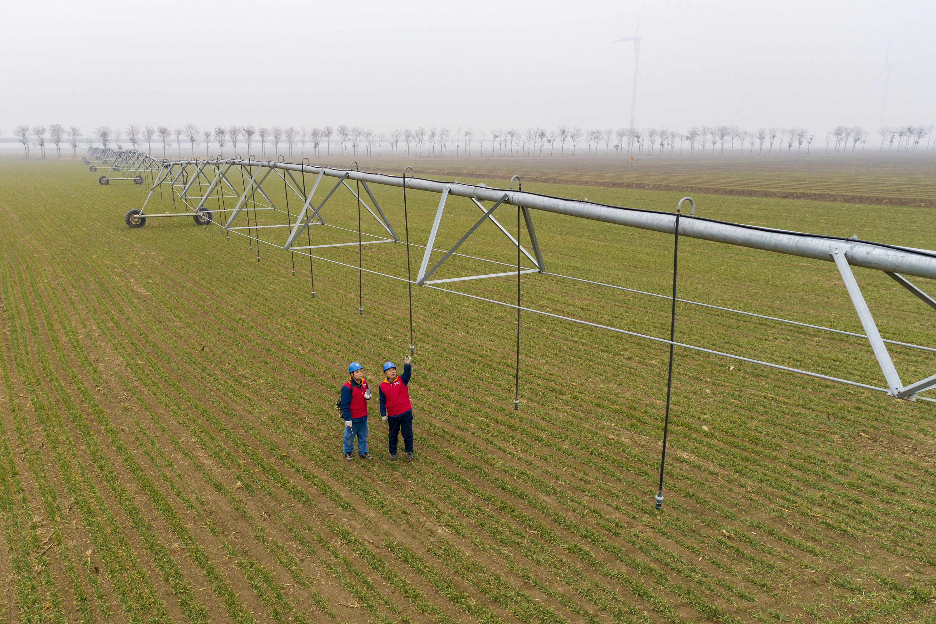 2月13日,在河南安阳滑县白道口蔡胡村,国网滑县供电公司白道口供电所焦裕禄党员服务队王建奇、温红涛正在为移动式多功能大型喷灌设备检查线路和用电设备,确保该设备春罐时安全可靠运行。