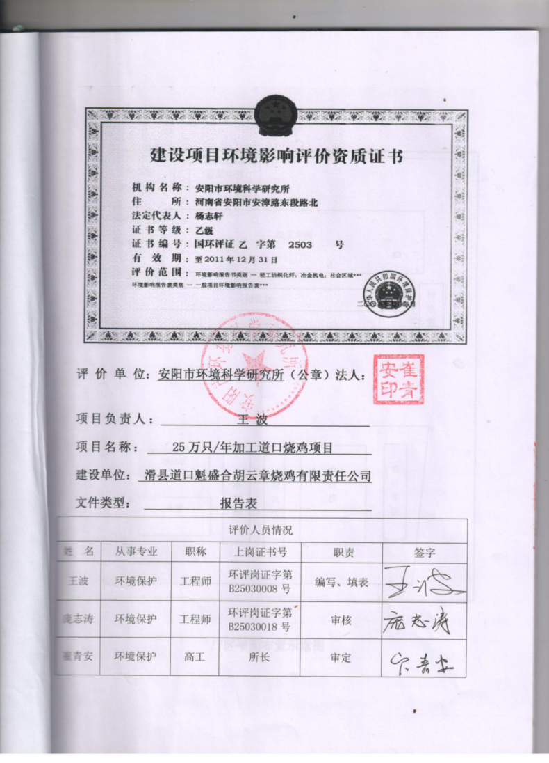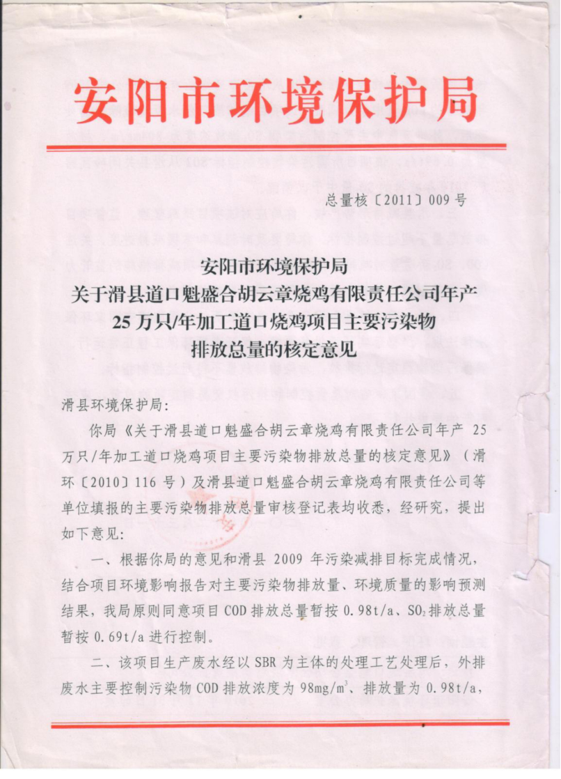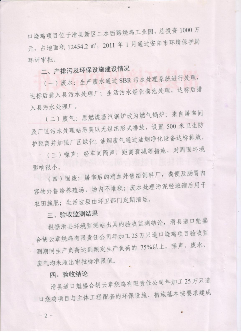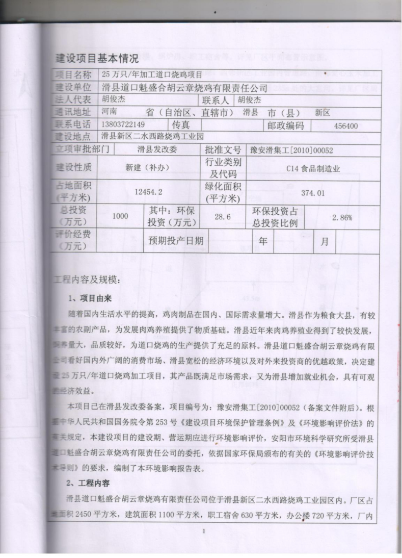 关于滑县道口魁盛合胡云章烧鸡有限责任公司年产25万只/年加工道口烧鸡项目环评公示