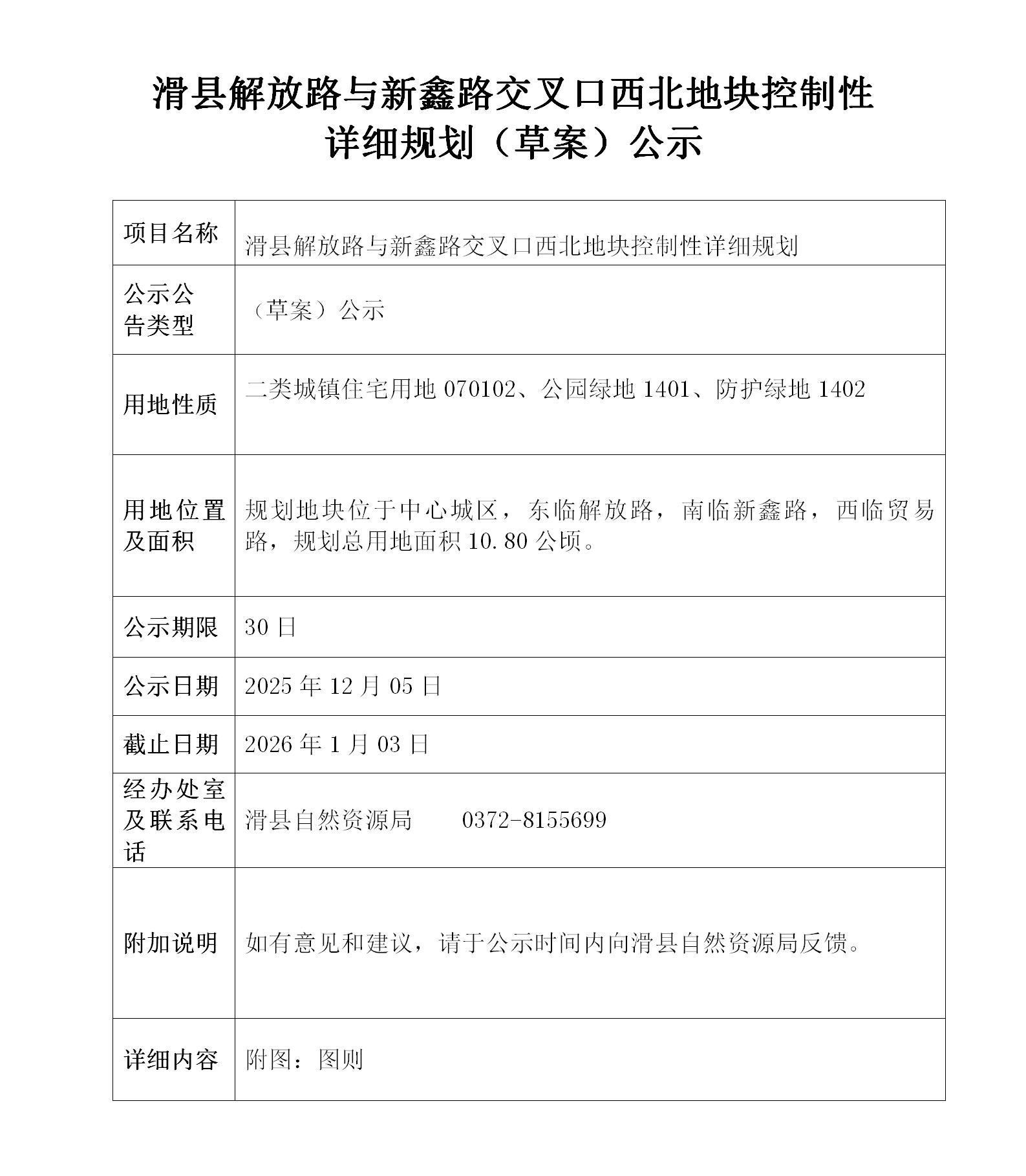 滑县解放路与新鑫路交叉口西北地块控制性详细规划(草案)公示