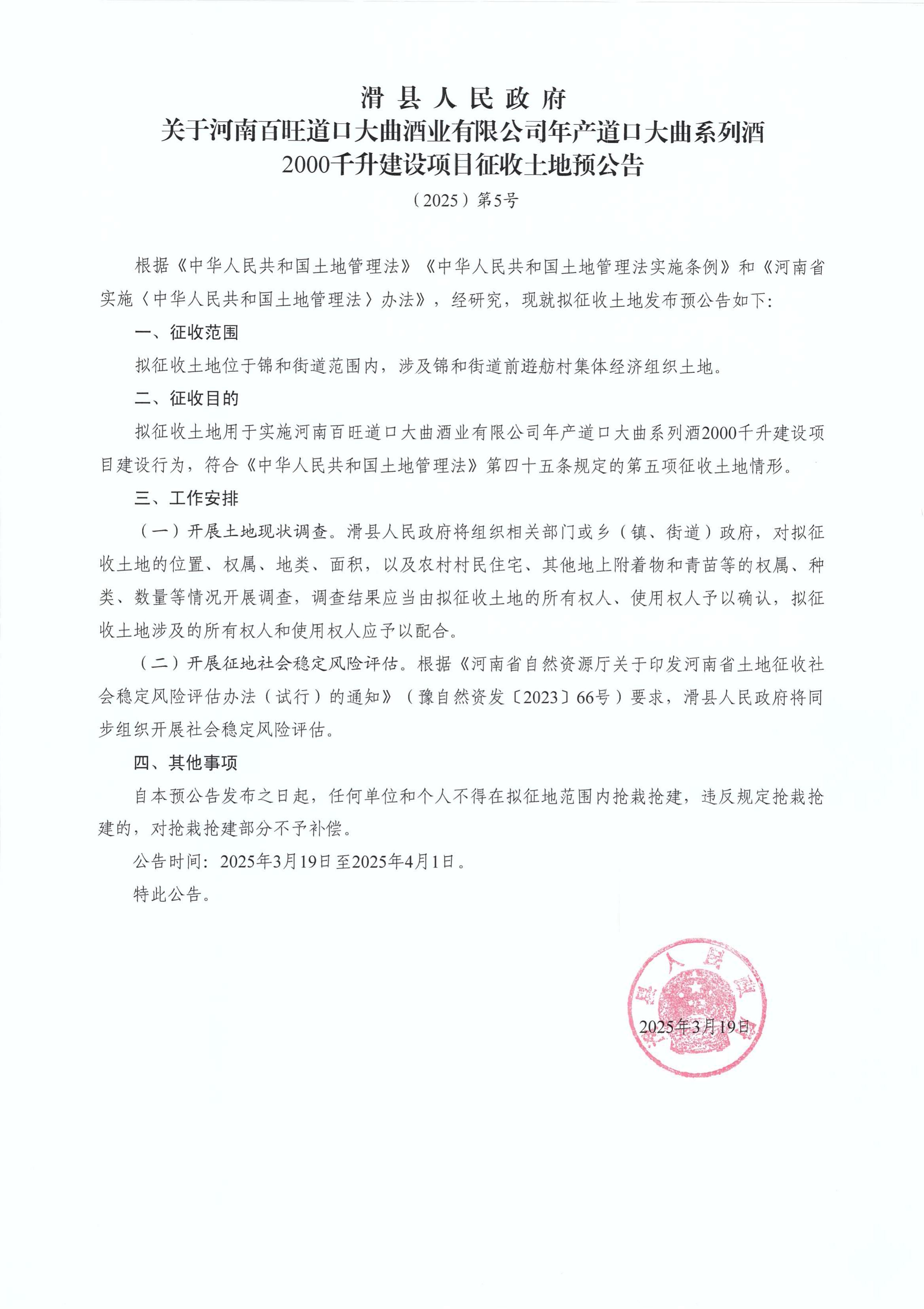 滑县人民政府关于河南百旺道口大曲酒业有限公司年产道口大曲系列酒2000千升建设项目征收土地预公告(2025)第5号