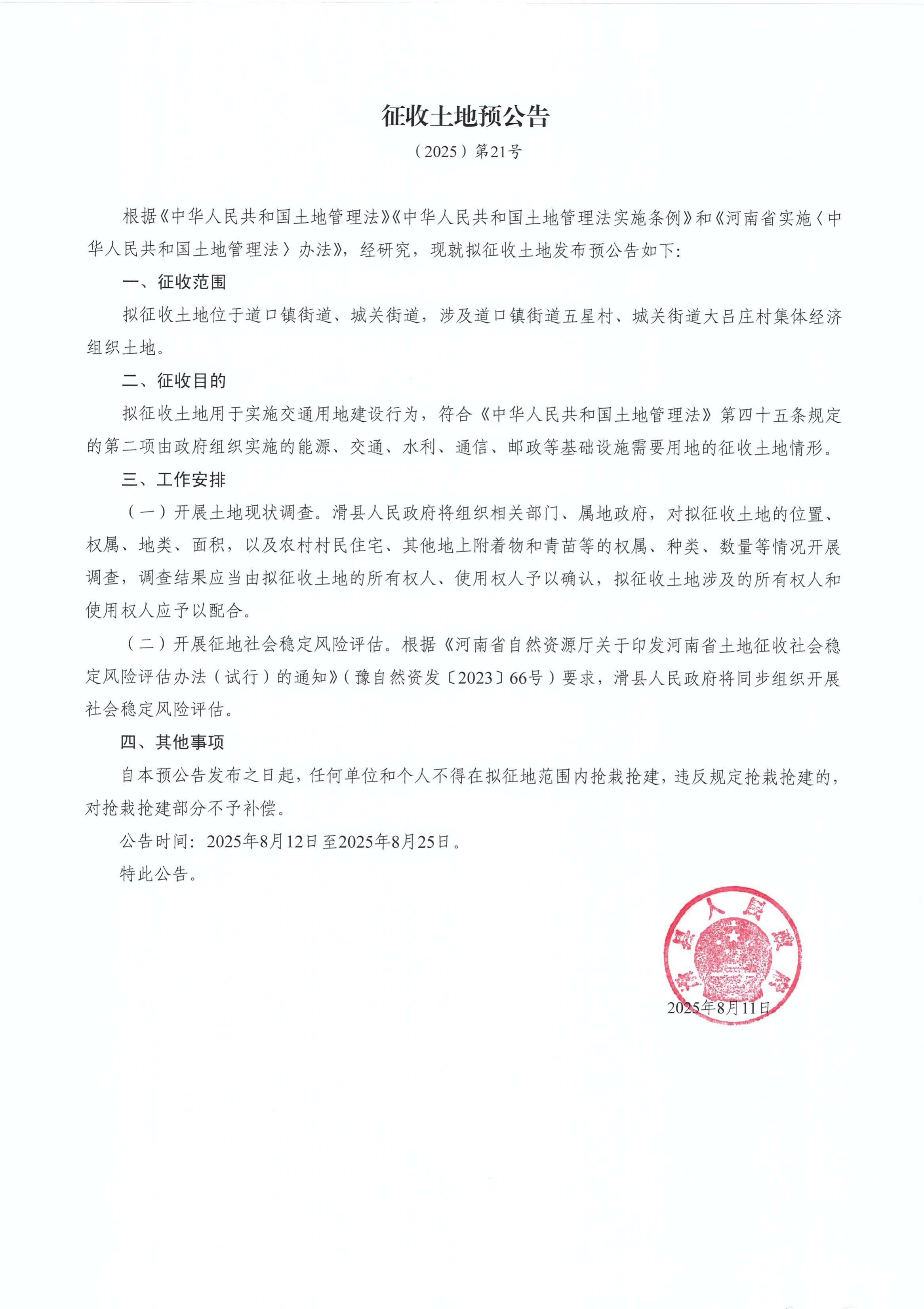 征收土地预公告(2025)第21号