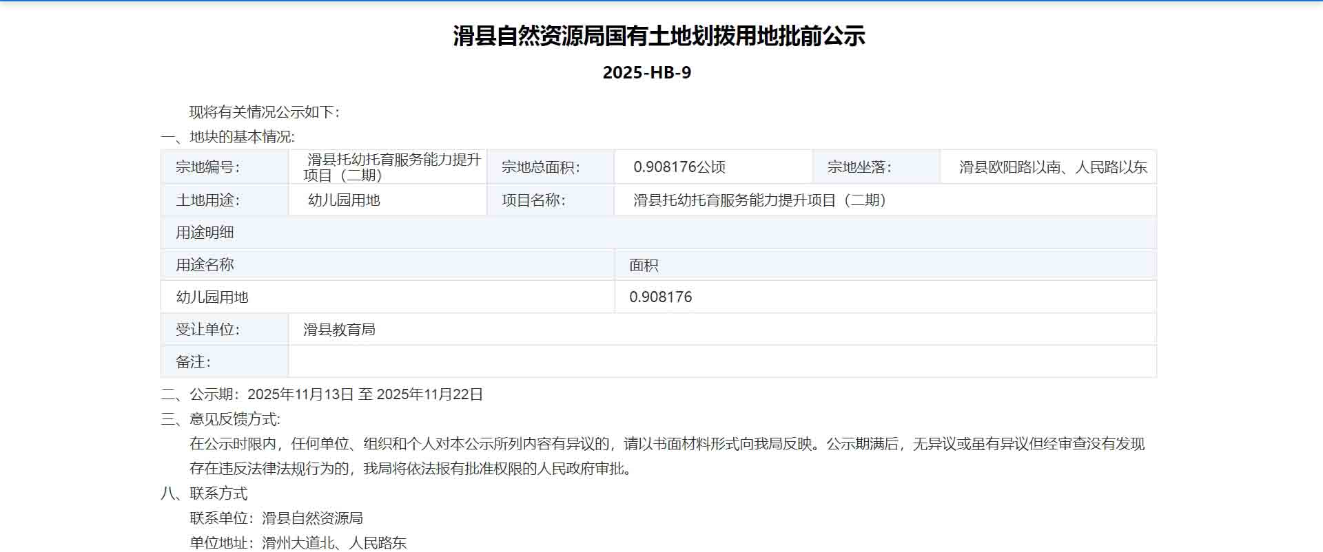滑县自然资源局国有土地划拨用地批前公示(2025-HB-9)